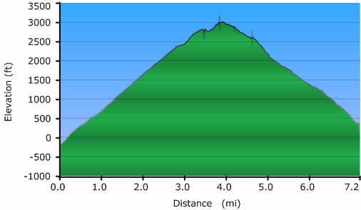 | I had an interesting encounter with a very big female deer on the mountain top, but other than that, I had the ridge to myself. I walked around a while, looking at the sites, and then headed down the mountain. On the way down, I passed a woman with three dogs. One of the dogs trotted past me just fine, but the other two stopped in their tracks, turned tail, and literally ran past the woman back down the trail. I don't know what spooked them, and neither did she. Eventually, I had to turn my back to them and take a few steps off the trail so that she could drag them past me by their collars. It was wierd. |
