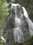 | It's a short, easy 1.7-mile trek to the falls and they're definitely worth the effort! The top of the falls is what I call 'champagne fountain' style, where the water cascades down onto boulders, pools, then overflows onto the next set of rocks, and repeats until the water is all spread out like a fountain at a wedding reception. But the bottom of the falls is a 'pounder', where the water recollects and then shoots through a narrow opening, slamming down into the pool below with tremendous force. It's a great combination of nice, gentle peaceful falls, and feel-it-in-your-chest, misty air, powerful falls. I had a great lunch there and was reluctant to leave. The day was hot, but by the falls, the mist kept me cool. |