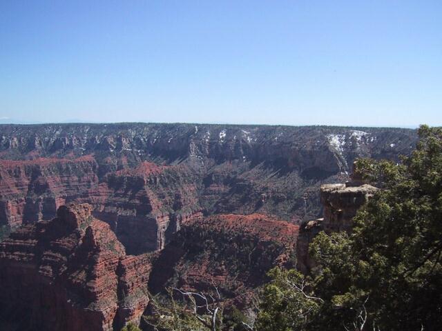 | We all enjoyed our visit to the North Rim of the Grand Canyon. As we approached the entrance to the Park, we passed fields and fields of snow, with melting ponds in them. We had no idea that the snow would still be around this time of year but it was beautiful. At the Visitor's Center, we learned that the Park had only opened one week prior to our visit, which explained all the snow. But the day was hot and we strolled along the viewpoint trail by the Lodge.