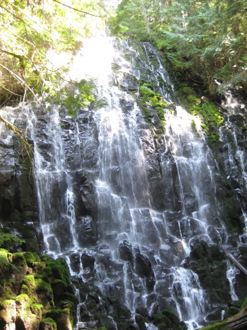 Ramona Falls is really neat because the whole falls comes from one little creek that tumbles over a rocky ledge, spreading out over the boulders, and then coming back together as a little brook, like nothing ever happened. The best description that I can think of for this falls is like a champagne fountain that you would see at a wedding, where the champagne flows out and into more and more glasses that are stacked up. It's amazing to sit and watch and feel the spray. The hike back was hot but the trail follows the 'shore' of the Sandy River when it's flooded, so there were lots of neat logpiles to look at. All in all, I'd love to go back! The trail is easy, with great footing, and it never gets very steep. |