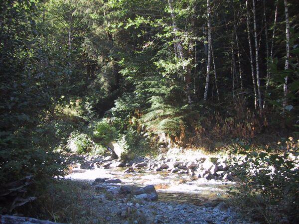To my surprise, we didn't get up until 8am the next day! That's quite late but the sun was blocked by the rain-forest canopy and if it hadn't been for the crows I think we would have slept even longer. We had breakfast (tea, coffee, and oatmeal) and struck camp. It was about 10am before we hit the road home and we stopped a while to talk to the caretaker at the cabin.Goldmyer Hot Springs has a long and fascinating history. It's on private property and only 20 people are permitted to visit the springs per day. Lin made our reservations back in June to ensure a Saturday night stay. Check out their website - it's really full of information. We had to cross the Middle Fork to get to the road, though, but the crossing was much easier this time. | ||||