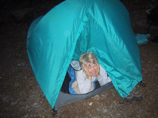 By the time we crossed Thunder Creek we were getting pretty tired and by the time we arrived at Burnboot Creek we were ready to get to the Hot Springs! And there they were, just across a cold shin-deep creek filled with slippery moss-laden stones. We filtered some water to fill our bottles and discussed our strategy for crossing. Despite our best efforts, we got pretty wet! But in no time at all, we were "checking in" at the little cabin and selecting our campsite from the several they have there. It's a beautiful, peaceful place and we wasted no time setting up our tents and heading for the Hot Springs. They were wonderful - so relaxing and soothing on our tired muscles. We languished in the water and talked for a long time before heading back to camp to make dinner. I think we all hit the sack around 10pm. | ||||